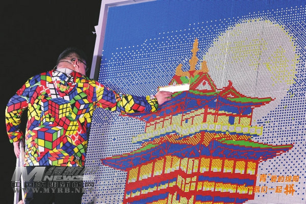 綿陽(yáng)新聞網(wǎng)訊 “危樓高百尺,手可摘星辰。不敢高聲語(yǔ),恐驚天上人。”千年前,李白的詩(shī)句道出了越王樓的氣勢(shì)磅礴。10月13日晚,由綿陽(yáng)市委對(duì)外宣傳辦公室主辦,綿陽(yáng)廣播電視臺(tái)、綿陽(yáng)交通廣播承辦的“‘青’愛(ài)的綿陽(yáng),我們一起拼”系列活動(dòng)之“手可摘星辰”活動(dòng),在城區(qū)濱江廣場(chǎng)舉行。綿陽(yáng)魔方達(dá)人張濤用10800個(gè)魔方現(xiàn)場(chǎng)拼出“天下詩(shī)文第一樓”越王樓的盛世重光,開(kāi)啟一場(chǎng)古今穿越之旅。