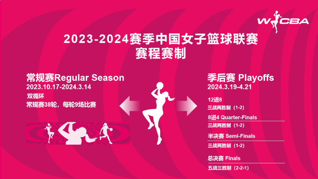 新賽季W(wǎng)CBA聯(lián)賽采取主客場雙循環(huán)賽制,常規(guī)賽38輪,每輪9場比賽。季后賽三戰(zhàn)兩勝制,總決賽五戰(zhàn)三勝制。