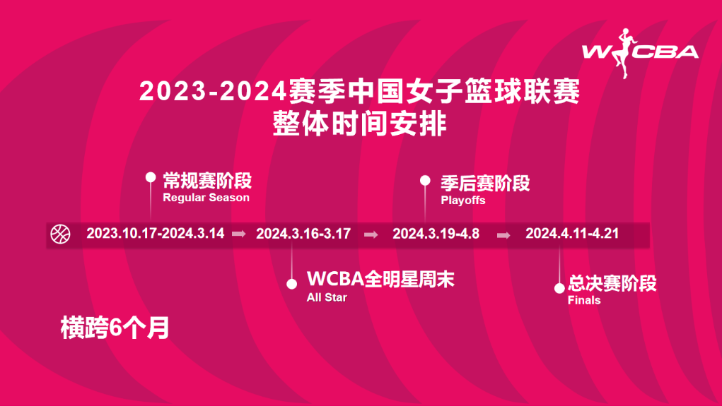 據(jù)了解,2023-2024賽季W(wǎng)CBA聯(lián)賽的整體時(shí)間跨度為6個(gè)月,考慮到新年、春節(jié),以及為國家隊(duì)備戰(zhàn)和參加巴黎奧運(yùn)會(huì)資格賽留出時(shí)間,聯(lián)賽常規(guī)賽會(huì)分為兩個(gè)階段,第一階段從2023年10月17日至2024年1月1日,第二階段從2024年2月17日至3月14日。全明星周末活動(dòng)將在2024年3月16至17日舉辦。季后賽和總決賽階段從3月19日至4月21日。