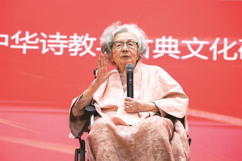 百歲葉嘉瑩分享了她新寫的詩:中華詩教播瀛寰,李杜高峰許共攀。喜見舊邦新氣象,要揮彩筆寫江山。她進(jìn)一步闡釋:“中華詩教要流播、要傳達(dá)給下一代,做出像李白、杜甫他們那樣偉大的成就。我們年輕人,要共同地向著這樣的高山去攀登。”“我們中國是一個古老、強(qiáng)大的國家,新生的氣象,新興起的事業(yè)都是非常輝煌的,非常遠(yuǎn)大的。我們江山的美好是書寫不完的。我們大家要努力,一起使我們的國家、我們的江山更加美麗,希望我們的前途更加遠(yuǎn)大。”