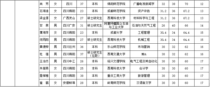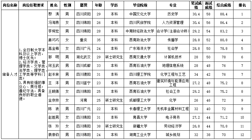 根據(jù)綿陽燃氣集團有限公司發(fā)布的招聘公告及招聘相關規(guī)定,經(jīng)筆試、面試等程序,現(xiàn)將綜合成績予以公示。