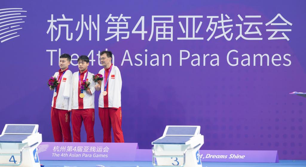 10月25日,冠軍中國選手楊洪(中)、亞軍王金剛(左)和季軍賈紅光(右)在男子200米個人混合泳-SM6級頒獎典禮上。新華社記者才揚攝