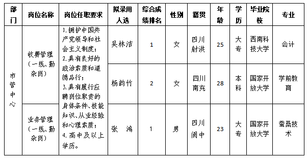 根據(jù)綿陽市高水農(nóng)副產(chǎn)品批發(fā)有限公司發(fā)布招聘公告及招聘相關(guān)規(guī)定,經(jīng)面試、考察、體檢等程序,擬錄用吳林潔等3名同志到綿陽市高水農(nóng)副產(chǎn)品批發(fā)有限公司工作,現(xiàn)予以公示,具體情況如下: