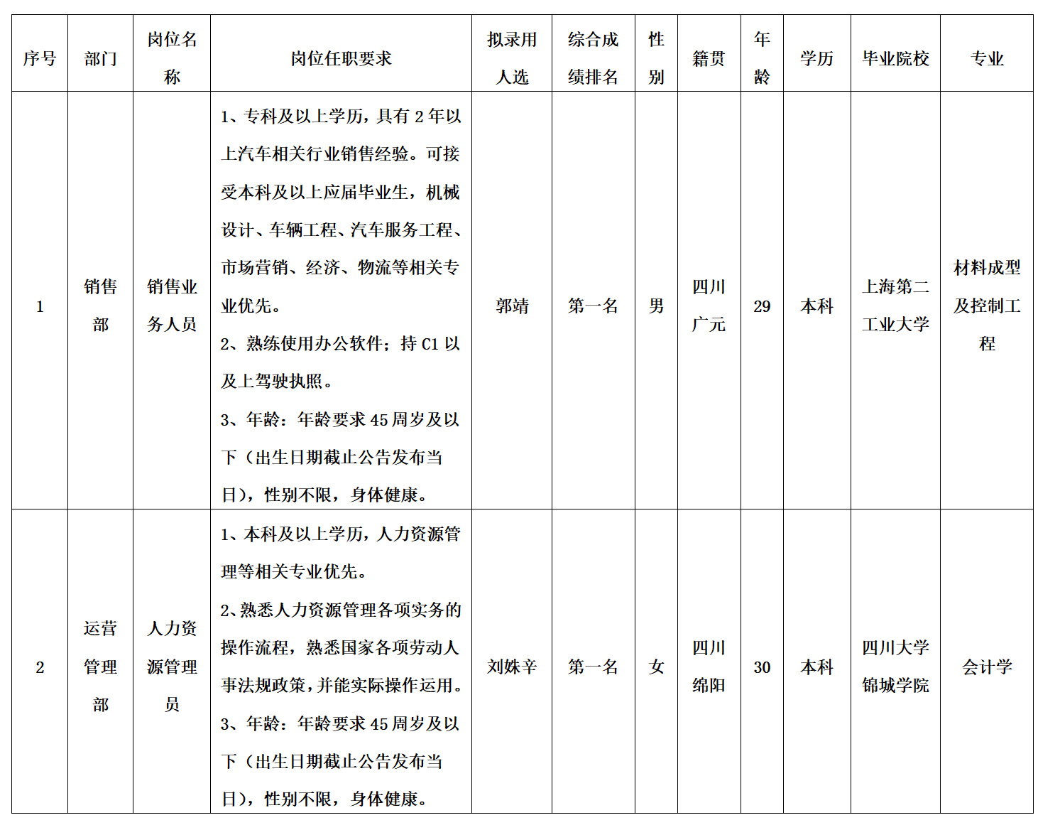 根據(jù)中國重汽集團綿陽專用汽車有限公司發(fā)布的招聘公告及招聘相關(guān)規(guī)定,經(jīng)面試、考察、體檢等程序,擬錄用郭靖同志為銷售業(yè)務(wù)人員,擬錄用劉姝辛同志為人力資源管理員,現(xiàn)予以公示,具體情況如下: