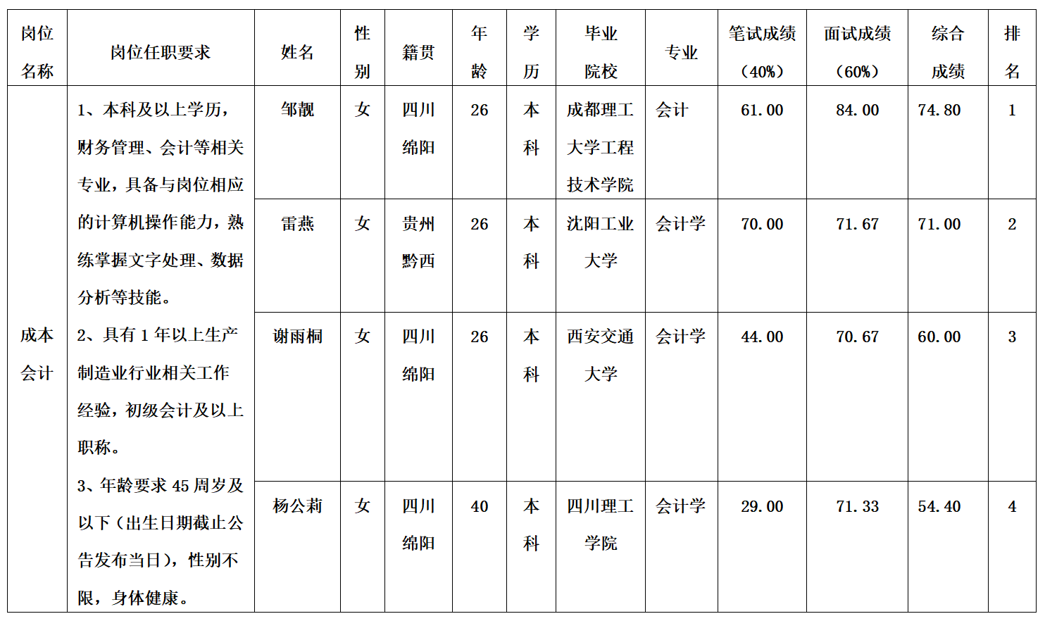 根據(jù)中國(guó)重汽集團(tuán)綿陽(yáng)專(zhuān)用汽車(chē)有限公司發(fā)布的招聘公告及招聘相關(guān)規(guī)定,經(jīng)筆試、面試程序,現(xiàn)將筆試、面試成績(jī)予以公示。