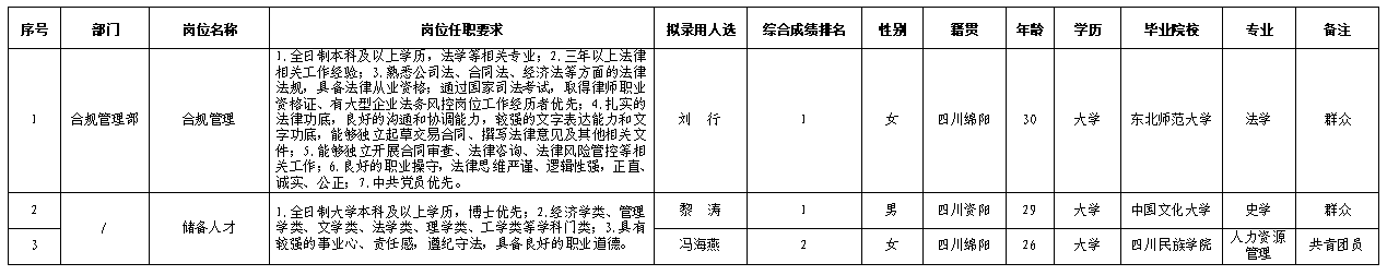 根據(jù)綿陽燃?xì)饧瘓F(tuán)有限公司發(fā)布的招聘公告及招聘相關(guān)規(guī)定,經(jīng)筆試、面試、考察、體檢等程序,擬錄用以下三名同志,現(xiàn)予以公示,具體情況如下: