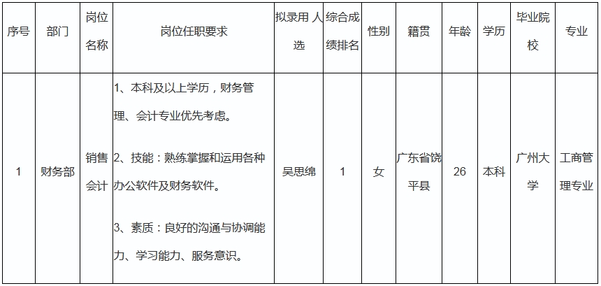 根據(jù)中山長(zhǎng)虹電器有限公司發(fā)布的招聘公告及招聘相關(guān)規(guī)定,經(jīng)筆試、面試、考察、體檢等程序,擬錄用吳思綿同志到銷(xiāo)售會(huì)計(jì)崗位工作,現(xiàn)予以公示,具體情況如下: