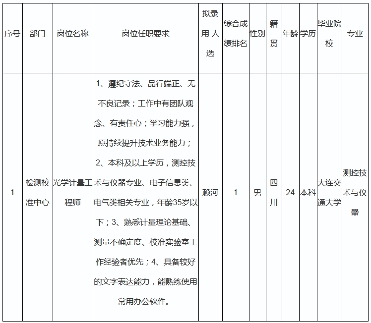 根據(jù)四川啟??丝萍加邢薰景l(fā)布的招聘公告及招聘相關(guān)規(guī)定,經(jīng)筆試、面試、考察、體檢等程序,擬錄用賴河同志到檢測(cè)校準(zhǔn)中心工作,現(xiàn)予以公示,具體情況如下: