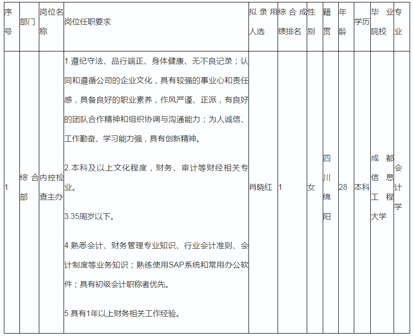 根據(jù)股份財(cái)務(wù)云中心發(fā)布的招聘公告及招聘相關(guān)規(guī)定,經(jīng)面試、考察、體檢等程序,擬錄用肖曉紅同志到股份財(cái)務(wù)云中心綜合部內(nèi)控組工作,現(xiàn)予以公示,具體情況如下: