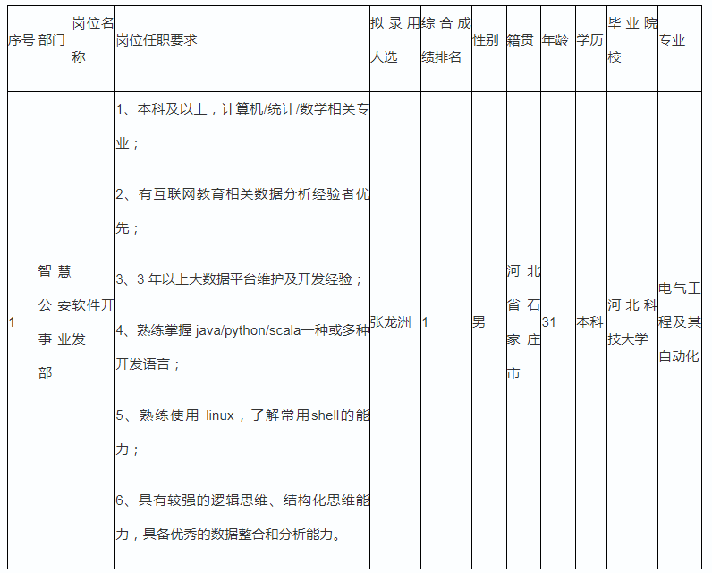 根據(jù)四川虹信軟件股份有限公司發(fā)布的招聘公告及招聘相關(guān)規(guī)定,經(jīng)筆試、面試、考察、體檢等程序,擬錄用張龍洲同志到四川虹信軟件股份有限公司工作,現(xiàn)予以公示,具體情況如下:
