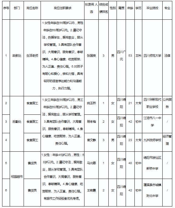 注:“生活老師”崗位綜合成績排名第1名與綜合成績排名2第二名兩名同志已自愿放棄。