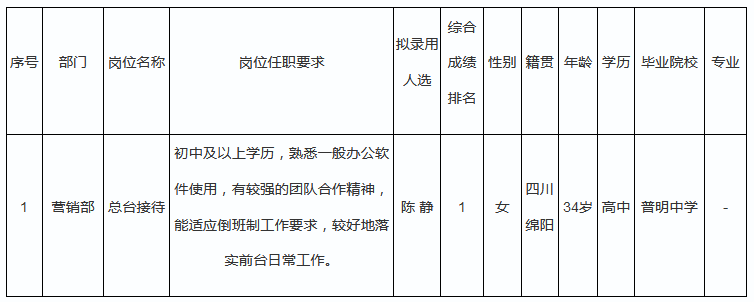 根據(jù)綿陽市東津酒店管理有限責(zé)任公司發(fā)布的長期招聘普通員工公告及招聘相關(guān)規(guī)定,通過公開招聘程序,擬錄用陳靜同志到綿陽市東津酒店管理有限責(zé)任公司工作,現(xiàn)予以公示,具體情況如下: