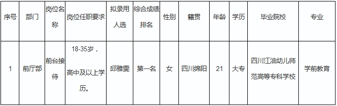 根據(jù)綿陽市綿州嘉來會務(wù)服務(wù)有限公司發(fā)布的招聘公告及招聘相關(guān)規(guī)定,經(jīng)面試、體檢等程序,錄用邱雅雯同志到綿陽市綿州嘉來會務(wù)服務(wù)有限公司前廳部工作,現(xiàn)予以公示,具體情況如下:
