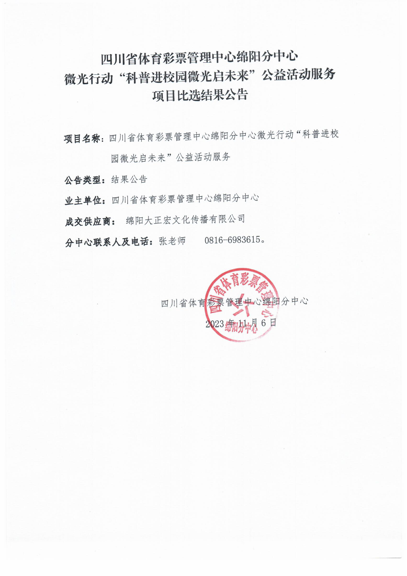 四川省體育彩票管理中心綿陽分中心微光行動“科普進校園微光啟未來”公益活動服務項目比選結果公告