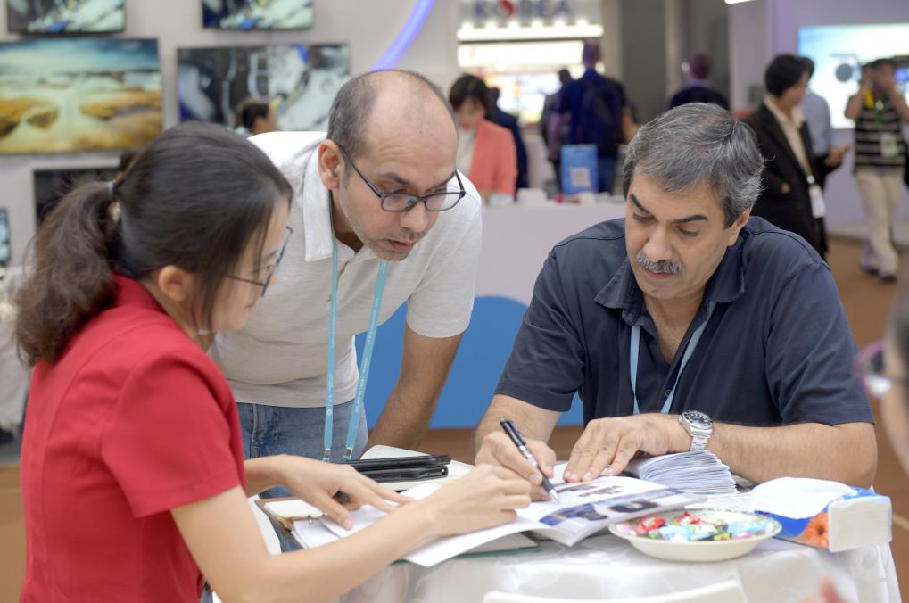10月15日,阿根廷客商在廣交會(huì)上參觀(guān)、洽談。新華社記者 盧漢欣 攝
