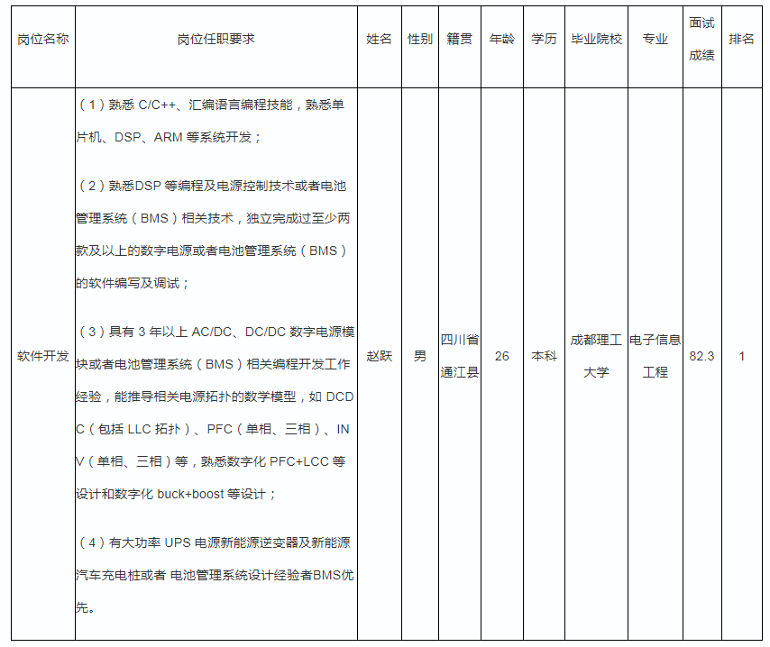 根據(jù)四川能創(chuàng)智電科技有限責(zé)任公司發(fā)布的招聘公告及招聘相關(guān)規(guī)定,經(jīng)簡歷篩選、面試等程序,現(xiàn)將面試成績予以公示。