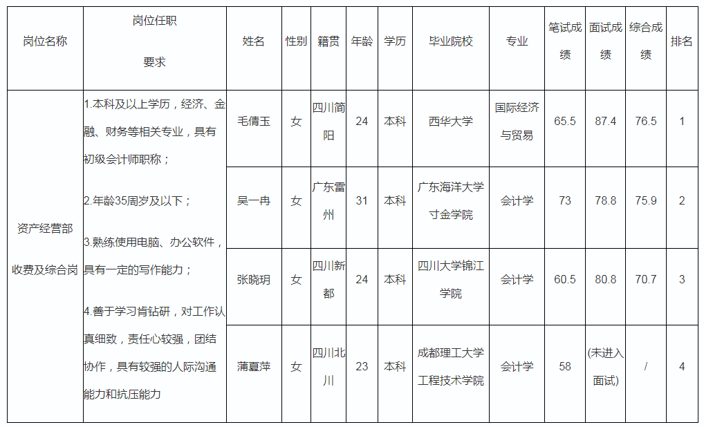 根據綿陽富達資產經營有限責任公司發(fā)布的招聘公告及招聘相關規(guī)定,經筆試、面試等程序,現將筆試(面試)成績予以公示。