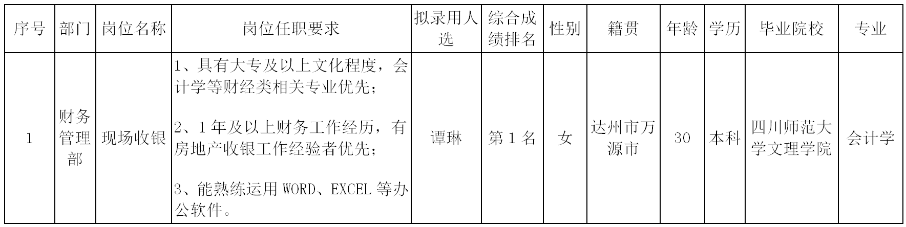 根據(jù)四川長(zhǎng)虹置業(yè)有限公司發(fā)布的招聘公告及招聘相關(guān)規(guī)定,經(jīng)筆試、面試、考察、體檢等程序,擬錄用譚琳同志到四川長(zhǎng)虹置業(yè)有限公司工作,現(xiàn)予以公示,具體情況如下: