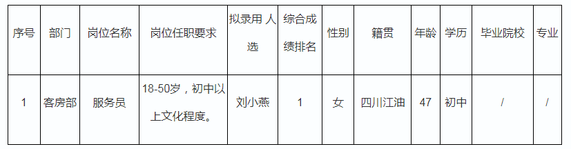 根據(jù)綿陽綿州酒店有限公司發(fā)布的招聘公告及招聘相關(guān)規(guī)定,經(jīng)面試、體檢等程序,錄用劉小燕同志到客房部工作,現(xiàn)予以公示,具體情況如下: