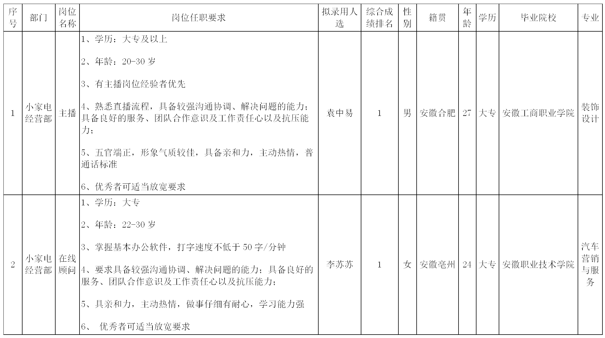 根據(jù)公司經(jīng)營管理需要,小家電經(jīng)營部招聘主播等崗位2人,經(jīng)簡歷篩選、面試、體檢等程序,袁中易等人滿足錄用條件,現(xiàn)予以公示。