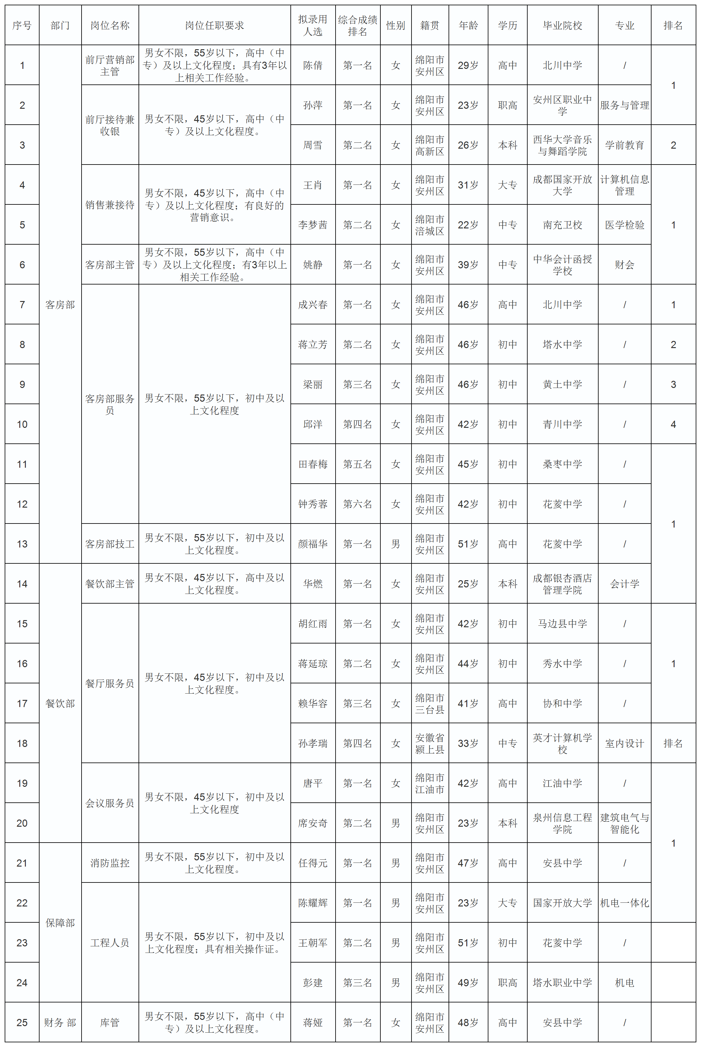 根據(jù)綿陽市綿州嘉來會務(wù)服務(wù)有限公司發(fā)布的招聘公告及招聘相關(guān)規(guī)定,經(jīng)面試、體檢等程序,擬錄用以下人員到客房部、餐飲部等部門工作,現(xiàn)予以公示,具體情況如下: