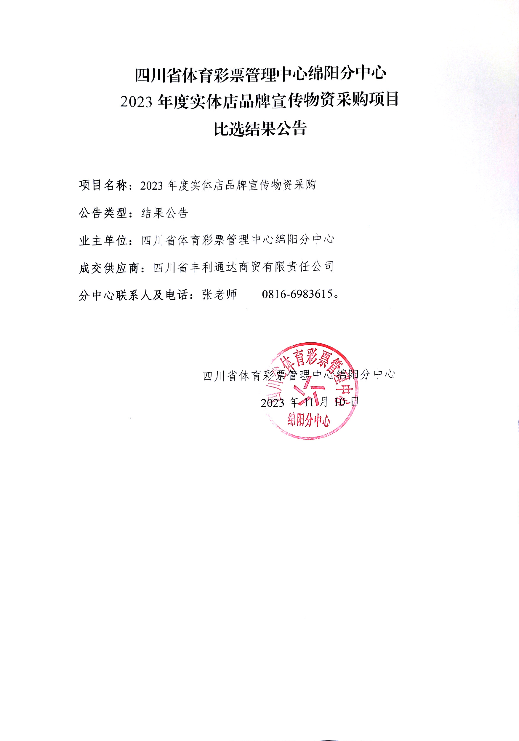 四川省體育彩票管理中心綿陽分中心 2023年度實體店品牌宣傳物資采購項目比選結(jié)果公告