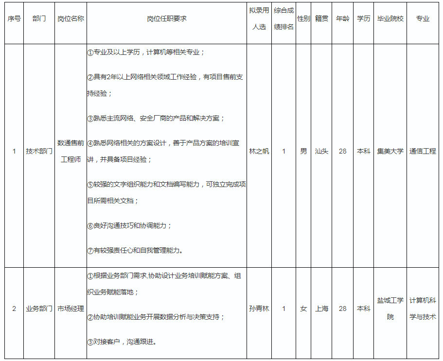 根據(jù)四川長虹佳華信息產品有限責任公司發(fā)布的招聘公告及招聘相關規(guī)定,經筆試、面試、考察、體檢等程序,擬錄用林之帆、孫青林同志到四川長虹佳華信息產品有限責任公司工作,現(xiàn)予以公示,具體情況如下:
