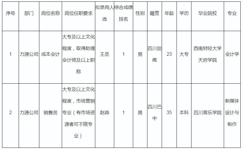 根據(jù)零八一電子集團(tuán)四川力源電子有限公司發(fā)布的招聘公告及招聘相關(guān)規(guī)定,經(jīng)筆試、面試、考察、體檢等程序,擬錄用王丞、趙淼同志到力源公司工作,現(xiàn)予以公示,具體情況如下: