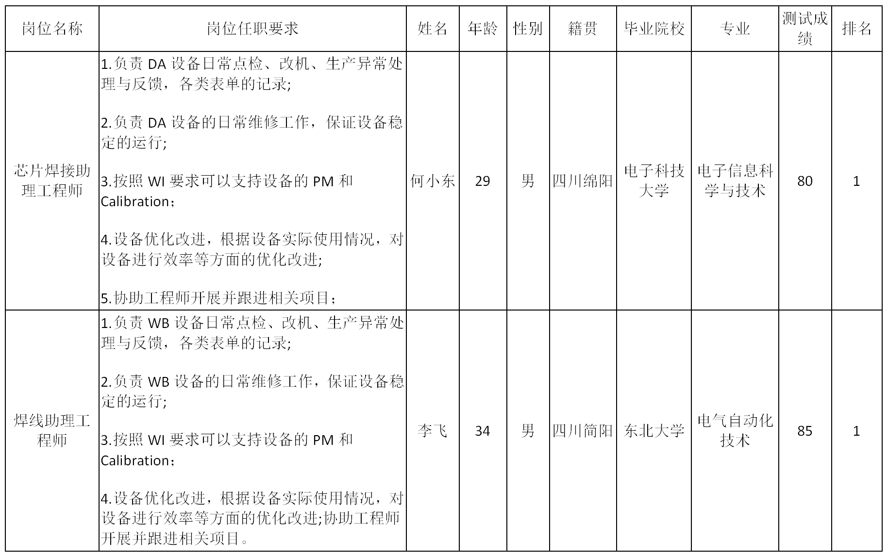 根據(jù)四川啟賽微電子有限公司發(fā)布的招聘公告及招聘相關(guān)規(guī)定,經(jīng)用人單位面試程序,現(xiàn)將測(cè)試合格人員予以公示。