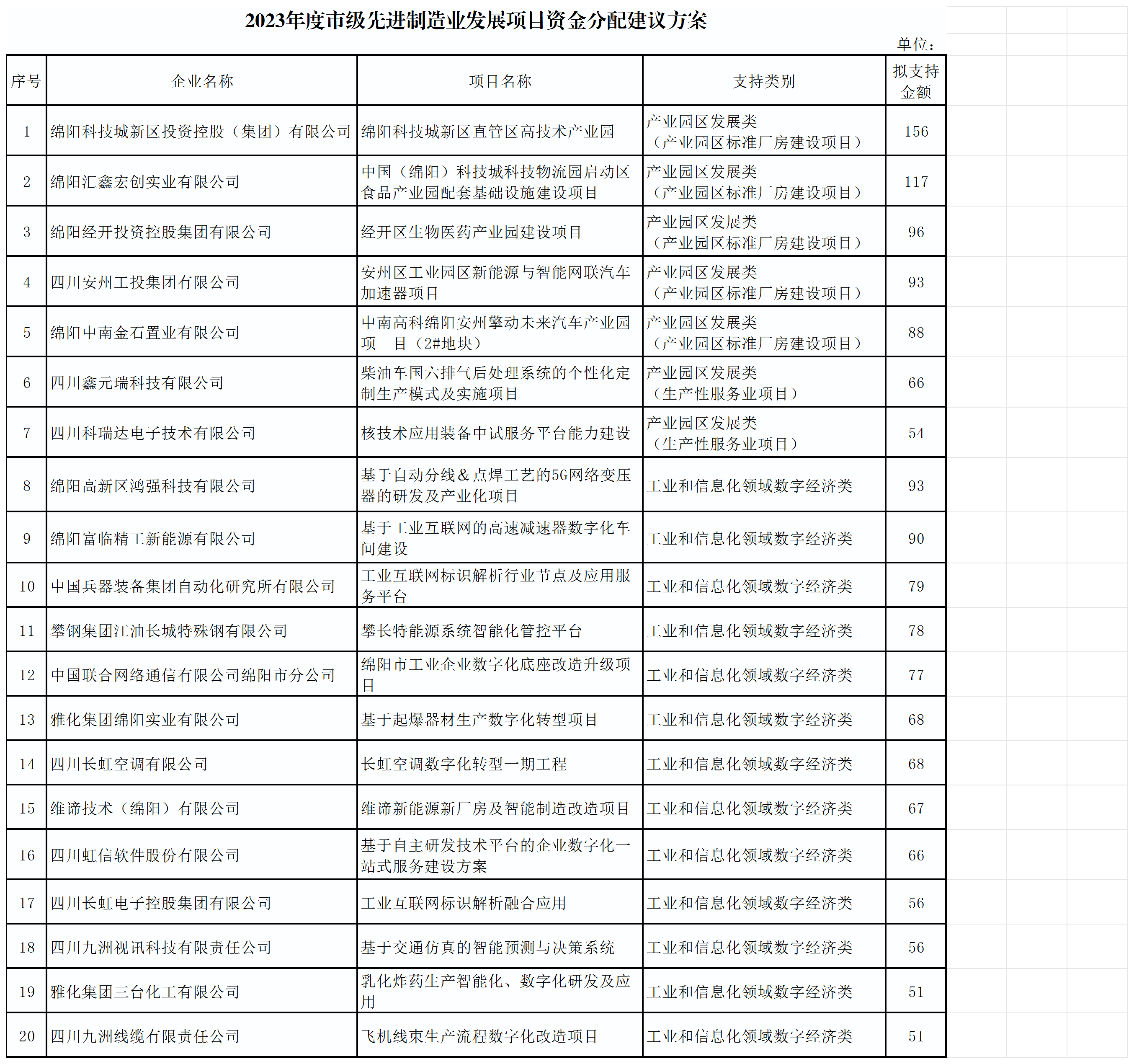 根據(jù)市經(jīng)信局《關(guān)于印發(fā)綿陽市2023年度市級(jí)先進(jìn)制造業(yè)發(fā)展項(xiàng)目資金申報(bào)指南的通知》(綿經(jīng)信財(cái)資〔2023〕491號(hào))要求,通過企業(yè)自主申報(bào),縣市區(qū)(園區(qū))工業(yè)經(jīng)濟(jì)主管部門初審?fù)扑],經(jīng)相關(guān)科室審核、專家評審、現(xiàn)場核查和市經(jīng)信局黨組會(huì)審議等程序?,F(xiàn)對擬支持的20個(gè)企業(yè)(項(xiàng)目)名單予以公示。