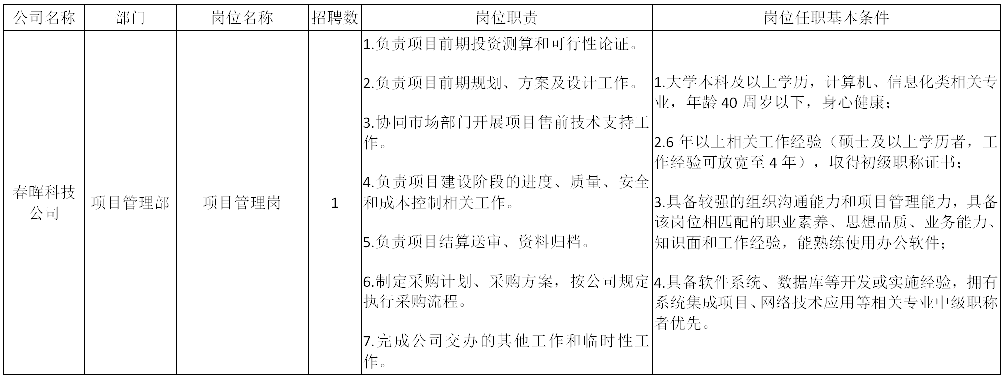 春暉科技公司項(xiàng)目管理部項(xiàng)目管理崗1名
