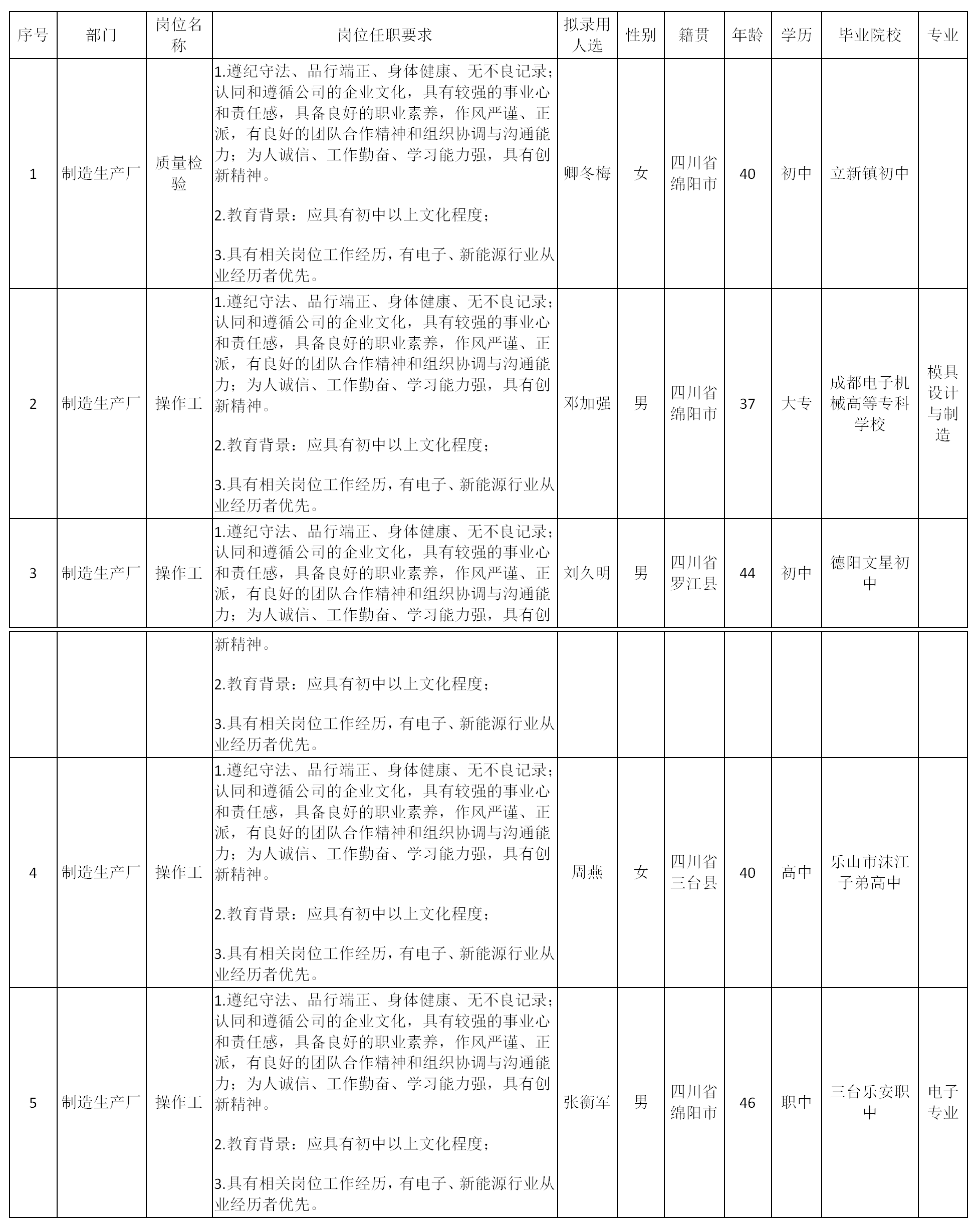 根據(jù)四川能創(chuàng)智電科技有限責(zé)任公司發(fā)布的招聘公告及招聘相關(guān)規(guī)定,經(jīng)面試、考察、體檢等程序,擬錄用卿冬梅等5位同志到四川能創(chuàng)智電科技有限責(zé)任公司工作,現(xiàn)予以公示,具體情況如下: