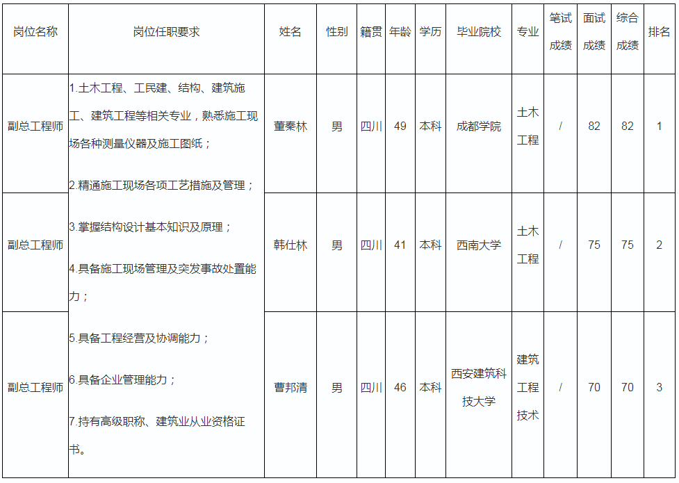 根據(jù)四川九洲建筑工程有限責(zé)任公司發(fā)布的招聘公告及招聘相關(guān)規(guī)定,經(jīng)筆試、面試等程序,現(xiàn)將筆試(面試)成績予以公示。
