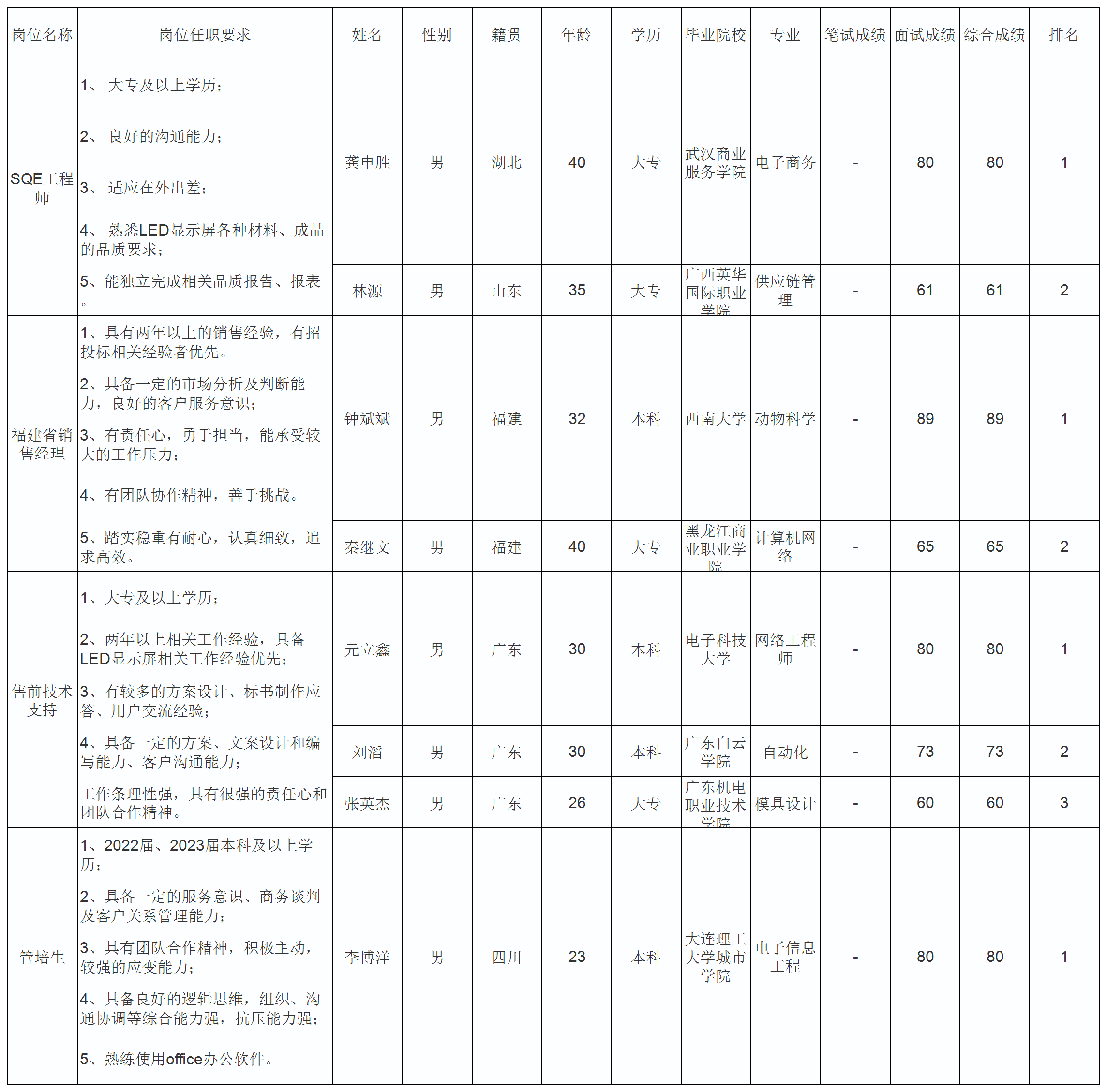 根據(jù)深圳市九洲光電科技有限公司發(fā)布的招聘公告及招聘相關(guān)規(guī)定,經(jīng)筆試、面試等程序,現(xiàn)將筆試(面試)成績(jī)予以公示。