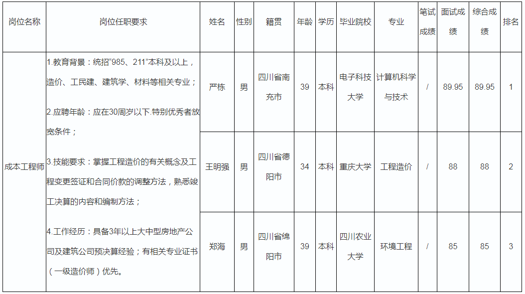 根據(jù)四川波鴻實(shí)業(yè)有限公司發(fā)布的招聘公告及招聘相關(guān)規(guī)定,經(jīng)初試、復(fù)試等程序,現(xiàn)將綿陽萬鴻房地產(chǎn)開發(fā)有限公司成本工程師崗位面試成績予以公示。