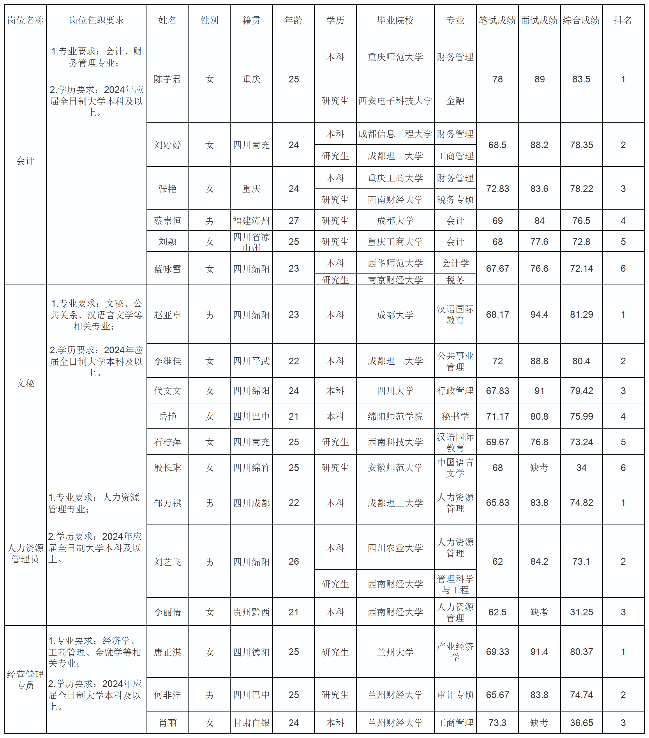 根據(jù)綿陽市水務(wù)(集團(tuán))有限公司發(fā)布的招聘公告及招聘相關(guān)規(guī)定,經(jīng)筆試、面試等程序,現(xiàn)將筆試(面試)成績予以公示。
