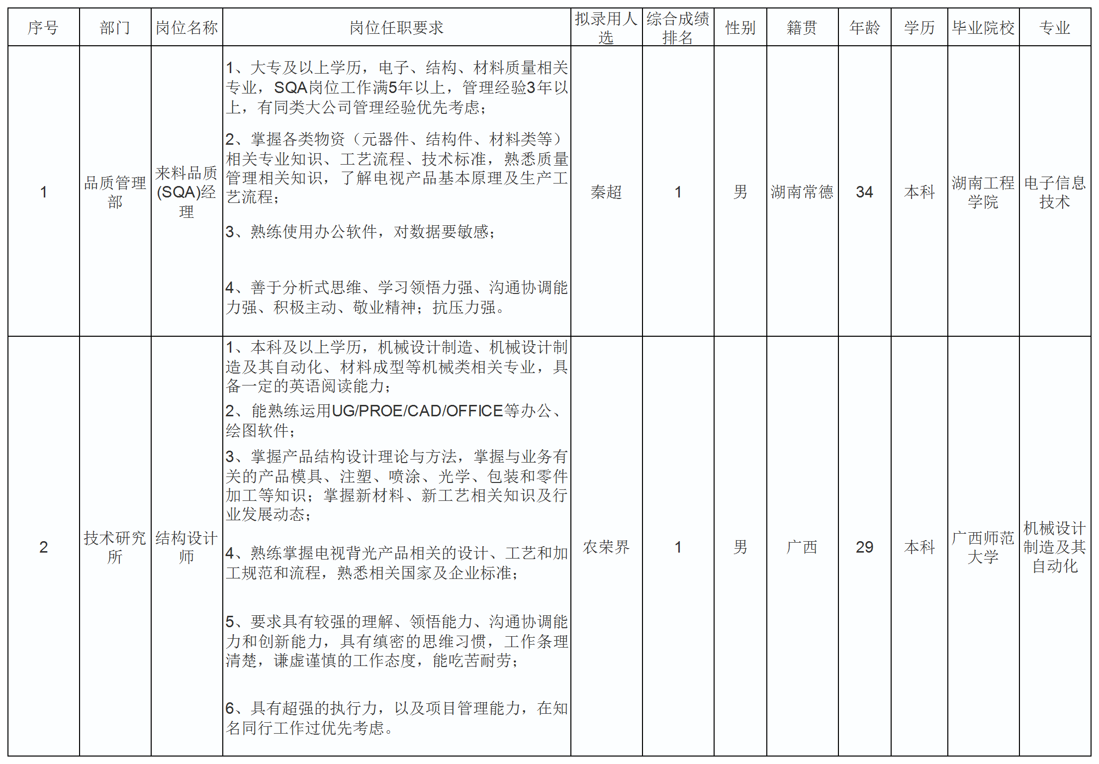 根據(jù)廣東長(zhǎng)虹電子有限公司發(fā)布的招聘公告及招聘相關(guān)規(guī)定,經(jīng)面試、考察、體檢等程序,擬錄用秦超同志到品質(zhì)管理部、農(nóng)榮界同志到技術(shù)研究所工作,現(xiàn)予以公示,具體情況如下: