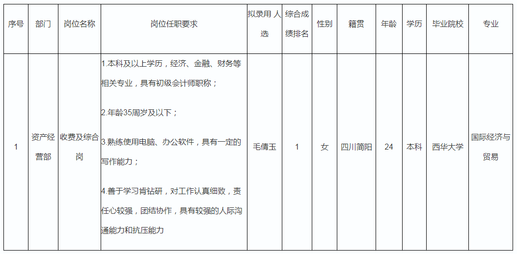 根據(jù)綿陽富達資產(chǎn)經(jīng)營有限責任公司發(fā)布的招聘公告及招聘相關規(guī)定,經(jīng)筆試、面試、考察、體檢等程序,擬錄用毛倩玉同志到資產(chǎn)經(jīng)營部收費及綜合崗工作,現(xiàn)予以公示,具體情況如下: