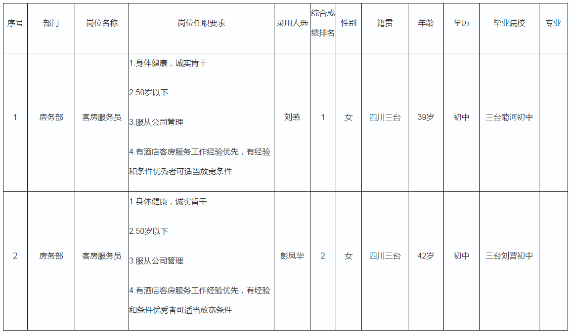 根據(jù)四川梓樂文化旅游開發(fā)有限公司發(fā)布的招聘公告及招聘相關(guān)規(guī)定,經(jīng)面試、考察、體檢等程序,錄用劉燕、彭鳳華兩位同志到梓州明宇麗雅酒店工作,現(xiàn)予以公示,具體情況如下: