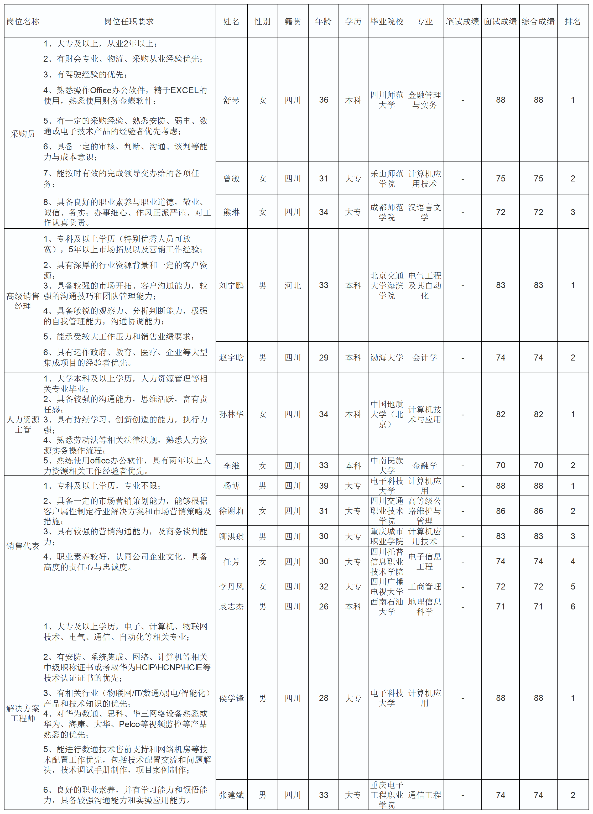 根據(jù)四川科瑞軟件有限責任公司發(fā)布的招聘公告及招聘相關(guān)規(guī)定,經(jīng)筆試、面試等程序,現(xiàn)將筆試(面試)成績予以公示。