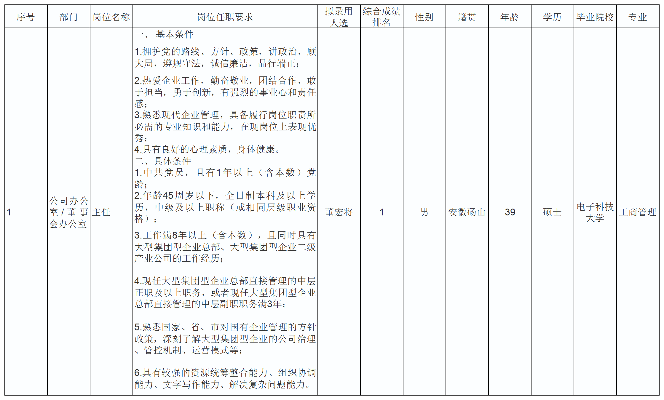 根據(jù)四川九洲投資控股集團(tuán)有限公司發(fā)布的招聘公告及招聘相關(guān)規(guī)定,經(jīng)筆試、面試、考察、體檢等程序,擬錄用董宏將同志到四川九洲投資控股集團(tuán)有限公司工作,現(xiàn)予以公示,具體情況如下: