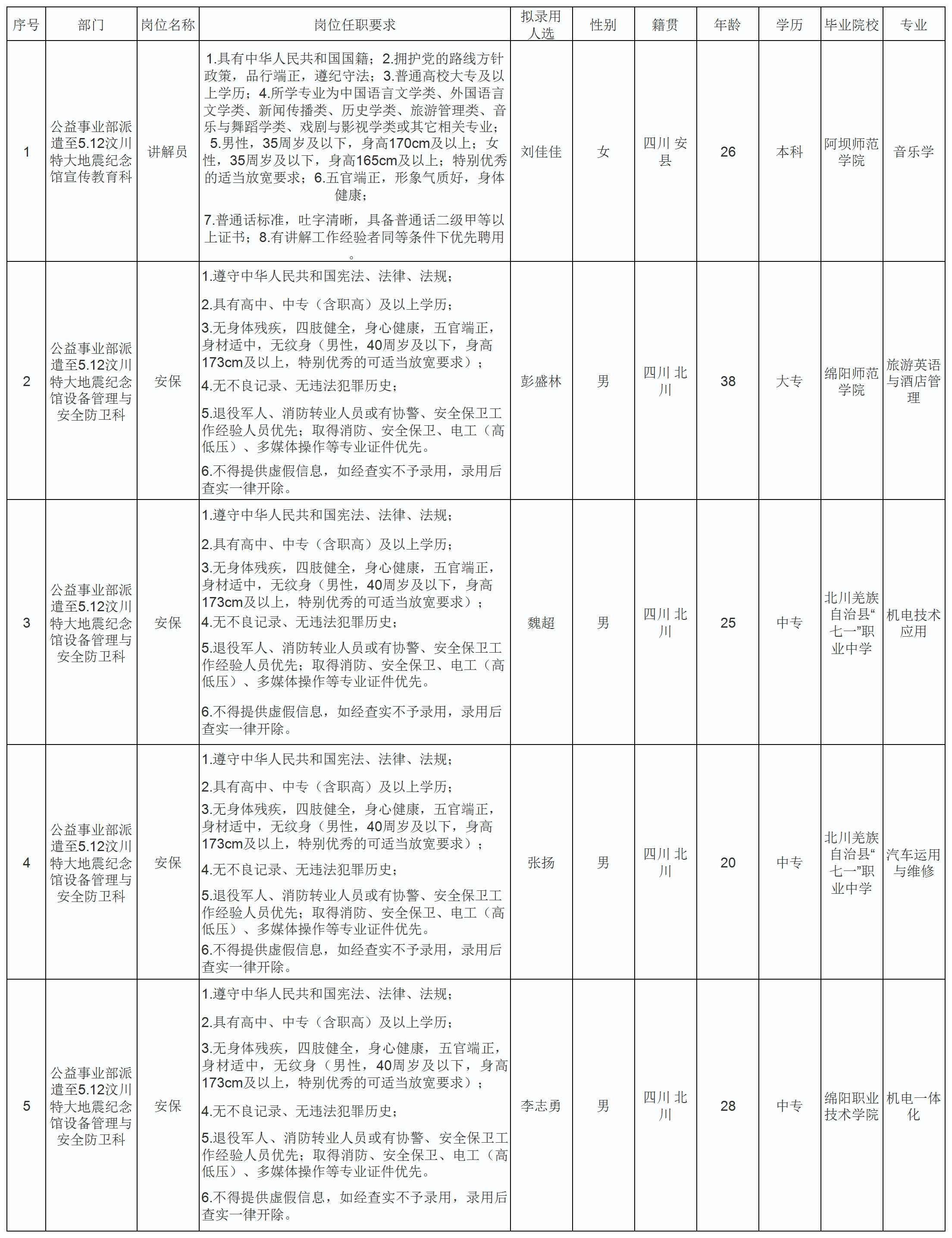 根據(jù)綿陽市匯澤投資有限公司發(fā)布的招聘公告及招聘相關(guān)規(guī)定,經(jīng)公開報名、資格審查、面試考核、體檢、現(xiàn)場考核等程序,擬聘劉佳佳同志到匯澤公司公益事業(yè)部派遣至5.12汶川特大地震紀念館宣傳教育科講解員崗位工作;擬聘彭盛林、魏超、張揚、李志勇四名同志到匯澤公司派遣至5.12汶川特大地震紀念館設(shè)備管理與安全防衛(wèi)科安保崗位工作?,F(xiàn)將擬聘人選情況予以公示:
