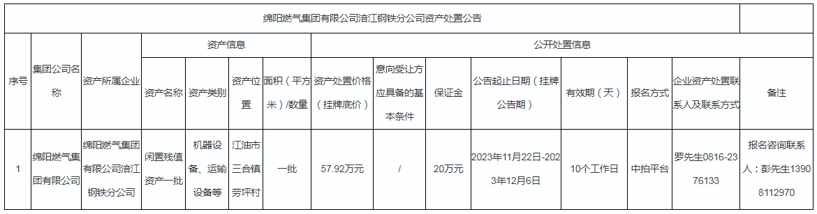 綿陽燃氣集團有限公司涪江鋼鐵分公司資產(chǎn)處置公告