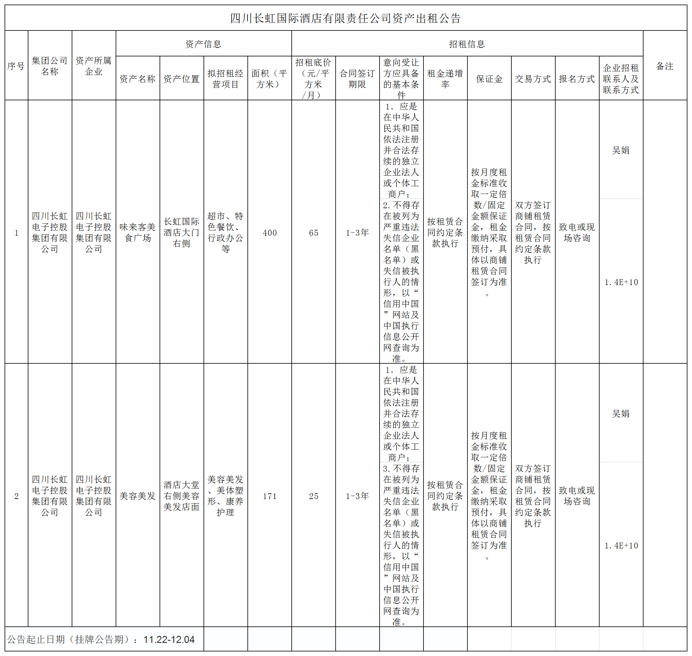 四川長(zhǎng)虹國際酒店有限責(zé)任公司資產(chǎn)出租公告