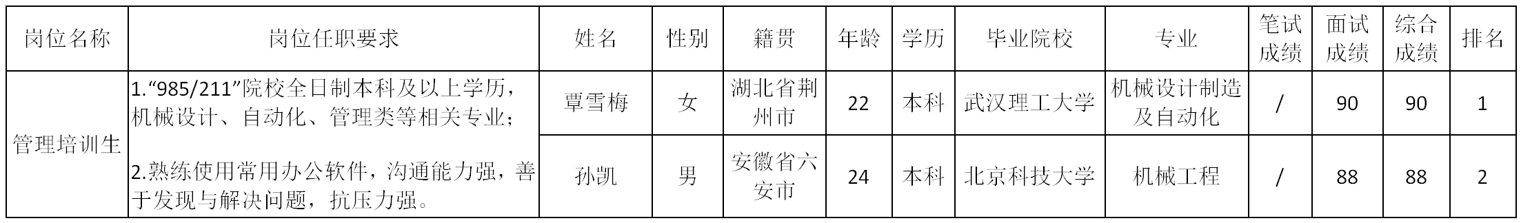 根據(jù)四川波鴻實業(yè)有限公司發(fā)布的招聘公告及招聘相關(guān)規(guī)定,經(jīng)筆試、面試等程序,現(xiàn)將威斯卡特工業(yè)(中國)有限公司管理培訓(xùn)生崗位面試成績予以公示。
