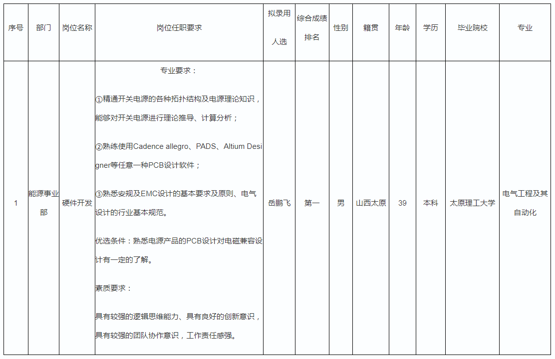 根據(jù)四川九州電子科技股份有限公司發(fā)布的招聘公告及招聘相關(guān)規(guī)定,經(jīng)筆試、面試、考察、體檢等程序,擬錄用岳鵬飛同志到四川九州電子科技股份有限公司工作,現(xiàn)予以公示,具體情況如下: