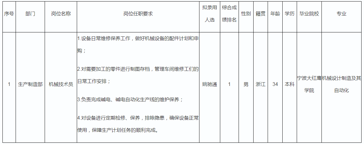 根據(jù)浙江長虹飛獅電器工業(yè)有限公司發(fā)布的招聘公告及招聘相關(guān)規(guī)定,經(jīng)筆試、面試、考察、體檢等程序,擬錄用姚馳通同志到浙江長虹飛獅電器工業(yè)有限公司工作,現(xiàn)予以公示,具體情況如下: