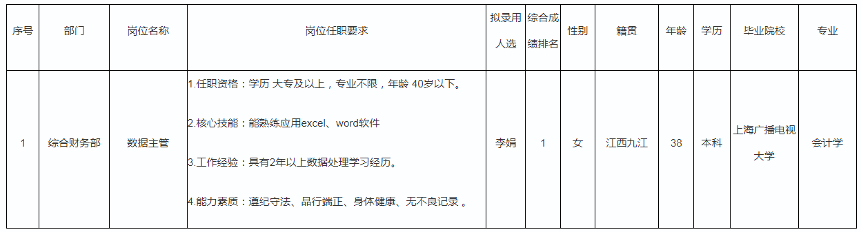 根據(jù)江蘇格潤新材料有限公司發(fā)布的招聘公告及招聘相關(guān)規(guī)定,經(jīng)筆試、面試、考察、體檢等程序,擬錄用李娟同志到江蘇格潤工作,現(xiàn)予以公示,具體情況如下: