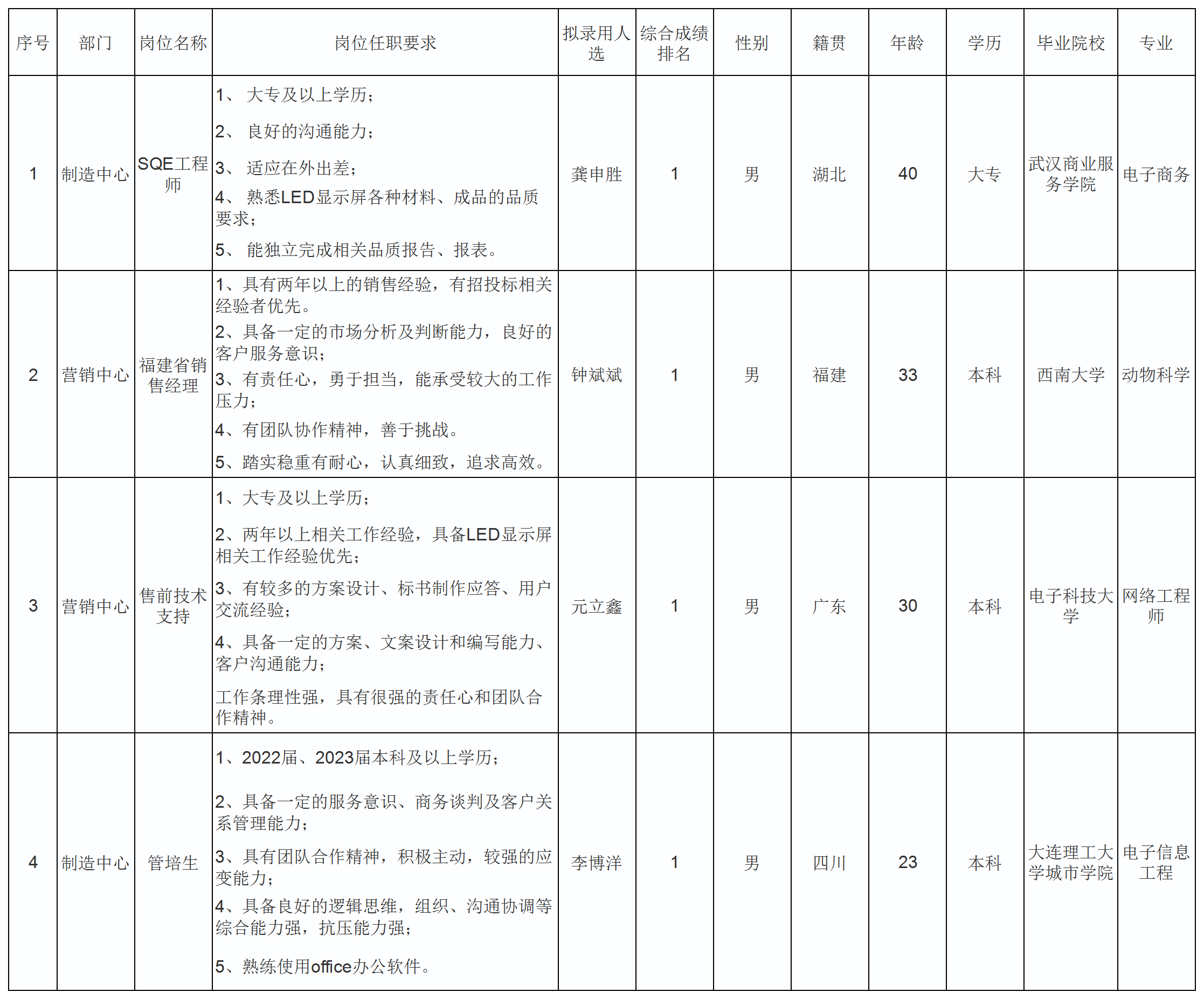 根據(jù)深圳市九洲光電科技有限公司發(fā)布的招聘公告及招聘相關(guān)規(guī)定,經(jīng)筆試、面試、考察、體檢等程序,擬錄用龔申勝、鐘斌斌、元立鑫、李博洋同志到深圳市九洲光電科技有限公司工作,現(xiàn)予以公示,具體情況如下: