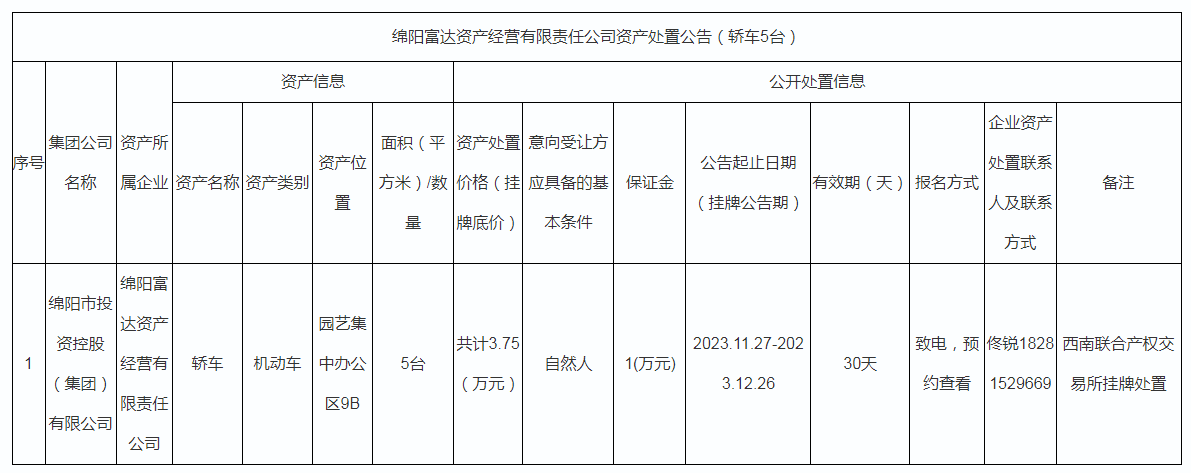綿陽(yáng)富達(dá)資產(chǎn)經(jīng)營(yíng)有限責(zé)任公司資產(chǎn)處置公告